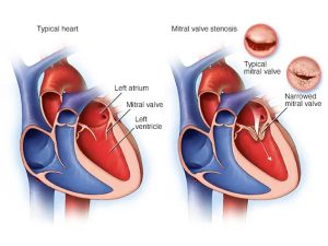 - Narrowing of the mitral valve, also called mitral valve stenosis. The valve flaps are stiff and the valve opening may be narrowed. This condition reduces blood flow from the left atrium to the left ventricle.