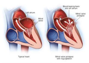 - Leaky mitral valve, also called mitral valve regurgitation. The valve flaps don’t close tightly. Sometimes they push backward into the left upper heart chamber as the heart squeezes. As a result, the mitral valve leaks blood.